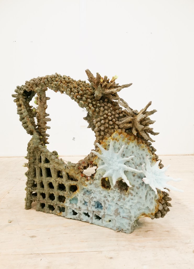 Concrete, steel armature, epoxy, fluorescent pigments, bismuth, neodymium magnets